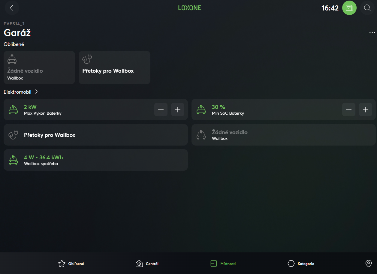 Instalovaný Loxone Wallbox s výkonem až 11 kW (3f, 16 A) je kompatibilní s širokou škálou elektromobilů, včetně modelu Škoda Elroq RS. Nabíjecí výkon je plynule regulovatelný v rozsahu cca 1,38–11 kW, což umožňuje přizpůsobit nabíjení aktuální energetické situaci v domě.